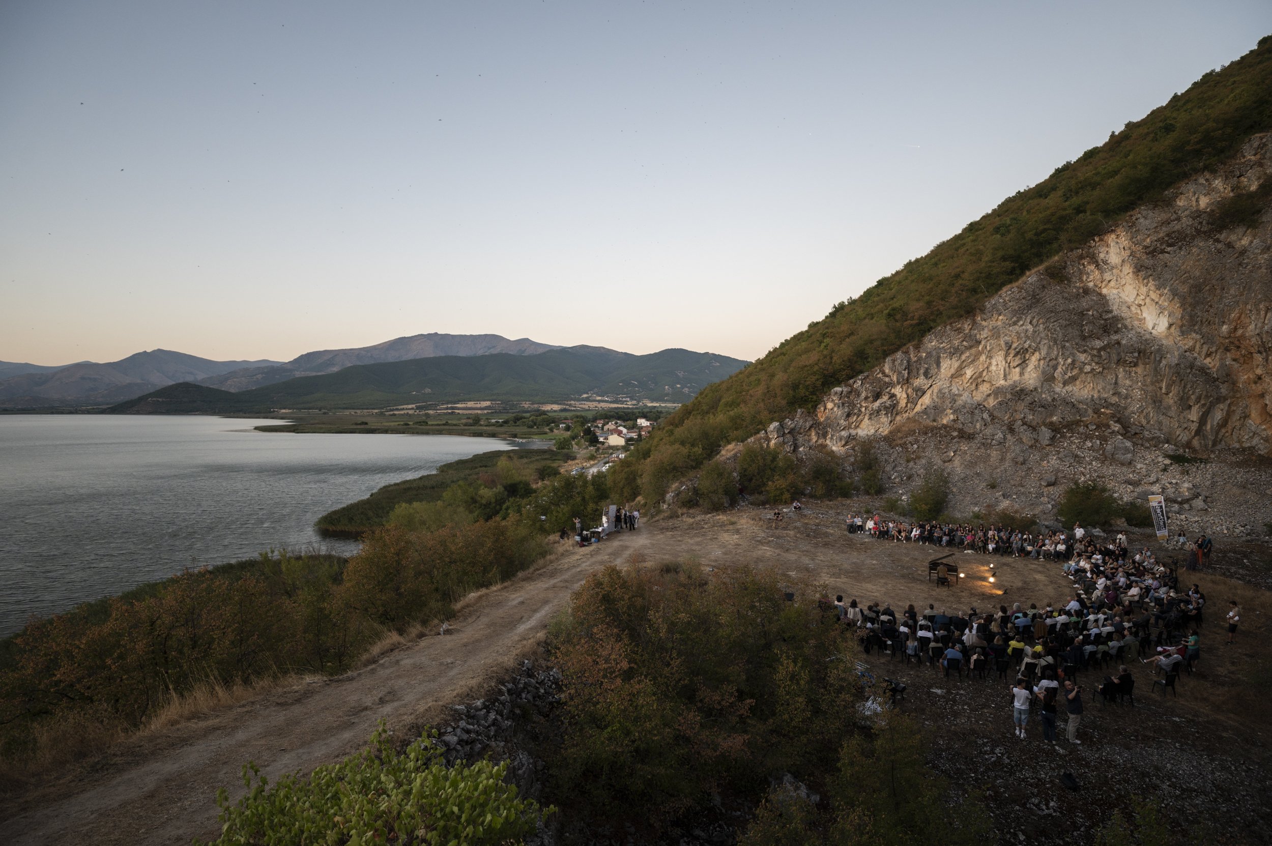 On Thursday evening, the packed old stone quarry (Damari) in Mikrolimni was transformed into an atmospheric concert venue, hosting the internationally acclaimed Austrian pianist Anton Gerzenberg alongside the Chaonia Polyphonic Ensemble. Overlooking Small Lake Prespa and set against a magical sunset, the audience was treated to a unique fusion of seemingly contrasting sounds that, over time, felt deeply familiar.